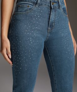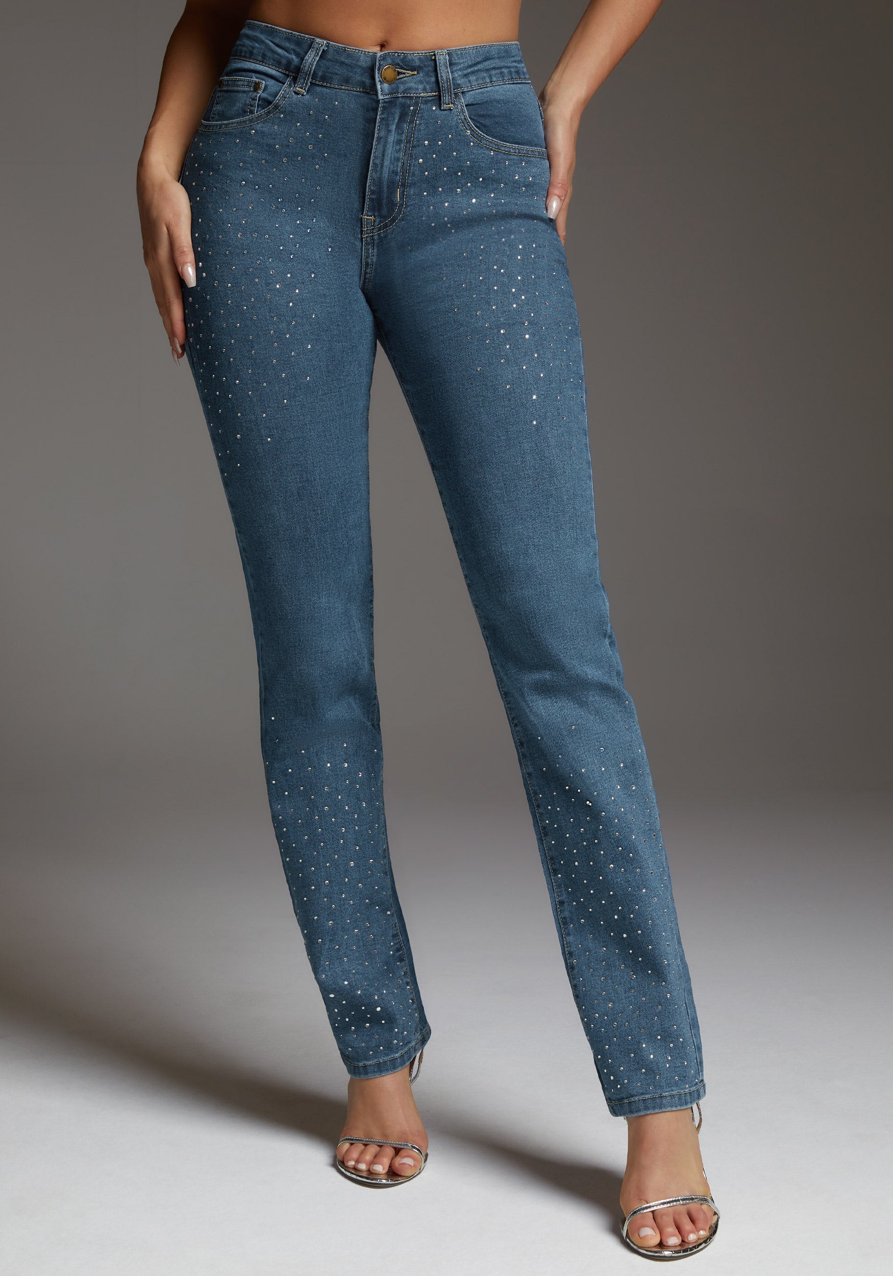 Comfort meets glamour in our rhinestone-adorned skinny jeans. Expertly crafted to flatter your figure and add sparkle to your wardrobe. Material & Care: Denim 75% Cotton, 23%Polyester,2%Spandex Machine Wash Cold With Like Colors, Only Non-Chlorine Bleach When Needed, Tumble Dry Low, Warm Iron If Needed, Do Not Iron On Decoration, Do Not Dry Clean. Imported